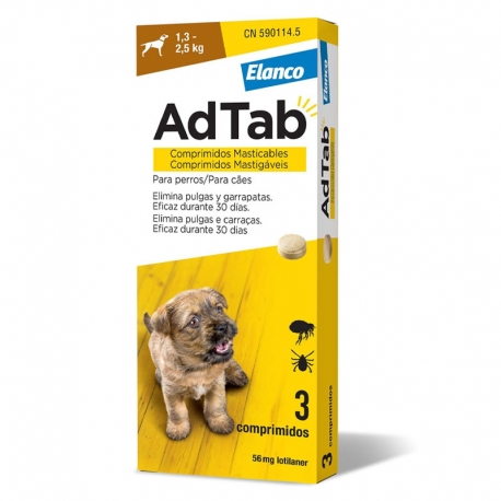 | ADTAB 56 mg COMPRIMIDOS MASTICABLES PARA PERROS (1,3–2,5 kg), Caja con 1 Blister de 3 Comprimidos | Perros de 1,3–2,5 kg | 56 mg Lotilaner |