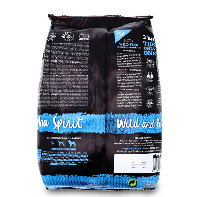 Composición: Pescado fresco, sardina 20%, pescadilla 20%, caballa 15%, jurel 15%, salmón 10%, dorada 10%, lubina 10%, almidón hidrolizado, guisantes, calabaza, zanahorias, boniato, cúrcuma, jenjibre, huevos frescos, manzana, kiwi, pera, arándanos, espinacas, hierbas y semillas aromáticas (romero, tomillo, orégano, comino, hinojo y alcaravea), levadura de cerveza, complejo mineral y vitamínico, taurina, glucosamina, condroitín sulfato.