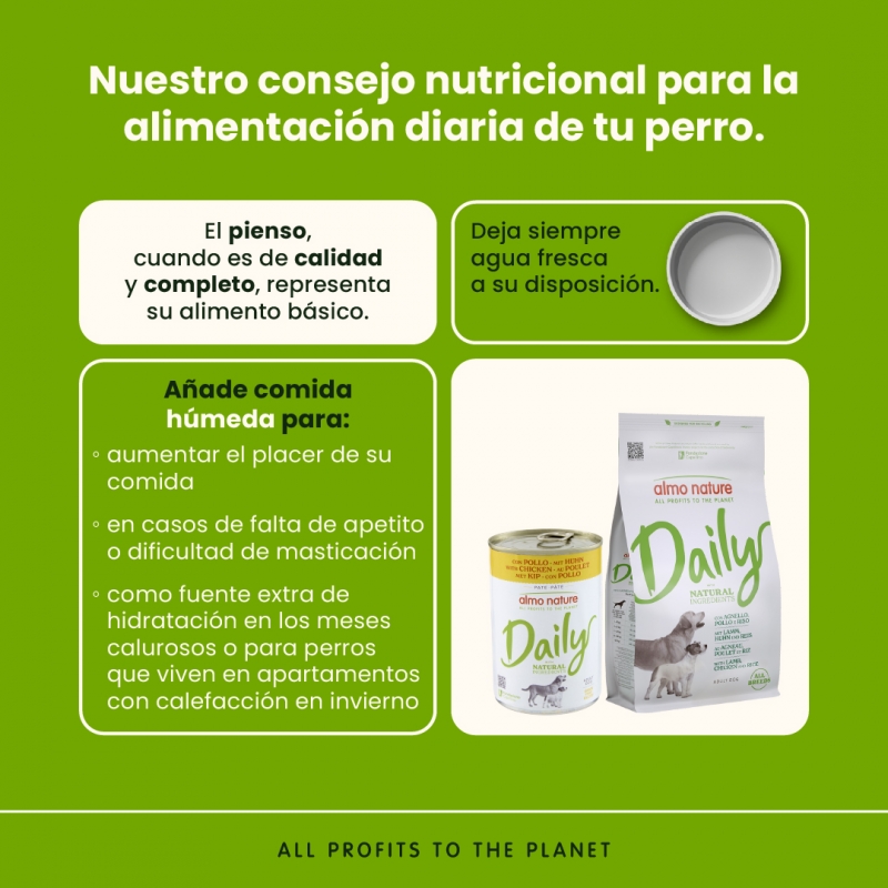 Gracias a su composición equilibrada, Almo Nature Daily puede utilizarse como alimento principal o como complemento en la dieta de tu perro. Su fórmula es perfecta para quienes buscan una alternativa más natural y nutritiva, sin ingredientes artificiales ni azúcares añadidos.