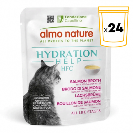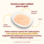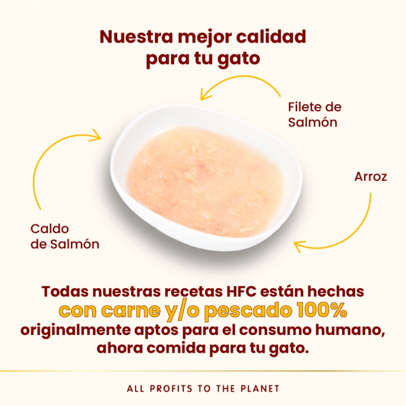 Receta HFC que combina caldo de salmón con filete de salmón de calidad human grade en una textura muy líquida que incentiva la ingesta de agua, ayudando a la hidratación del gato y al cuidado del tracto urinario. Fórmula monoproteica, sin aditivos ni subproductos, ideal para completar el pienso y mejorar la palatabilidad diaria.