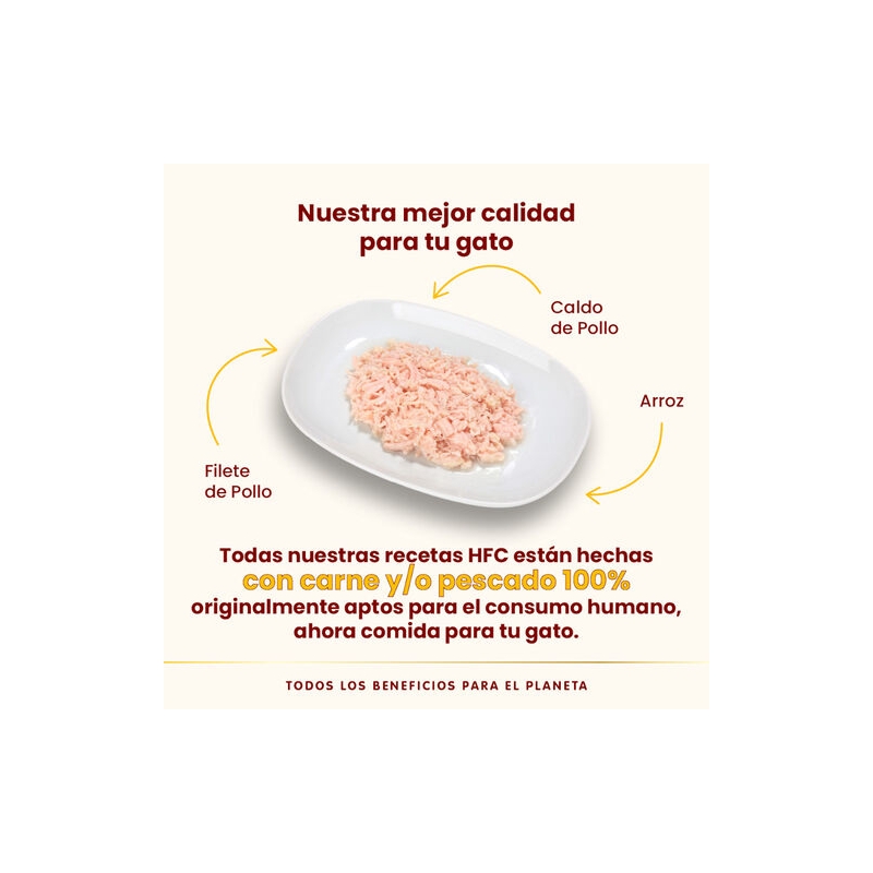 Receta HFC elaborada con filete de pollo y caldo de pollo de calidad apta para consumo humano, con fórmula monoproteica, baja en grasa y sin aditivos, pensada para apoyar el control de peso y la hidratación del gato esterilizado sin renunciar a la palatabilidad.