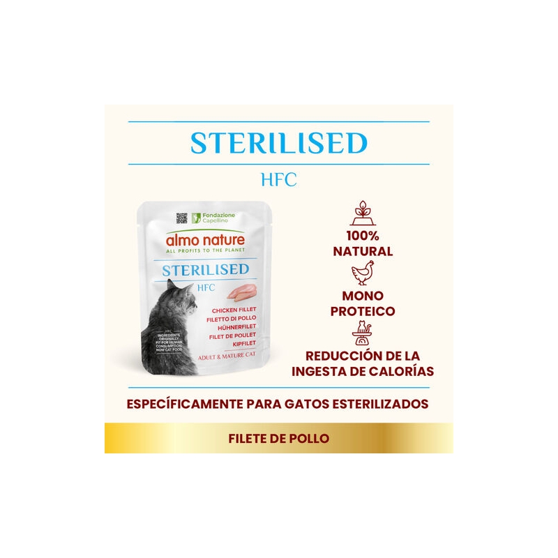 Comida húmeda para gatos esterilizados en caldo de pollo HFC, monoproteica, baja en grasa y sin aditivos, que potencia la hidratación y ayuda al control de peso.