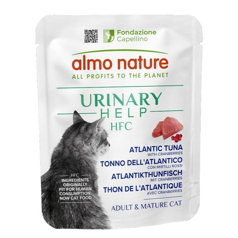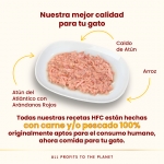 Comida húmeda para gatos en caldo HFC con atún del Atlántico y arándanos rojos, sin aditivos y de alta humedad, pensada para mejorar la hidratación y apoyar el bienestar urinario.