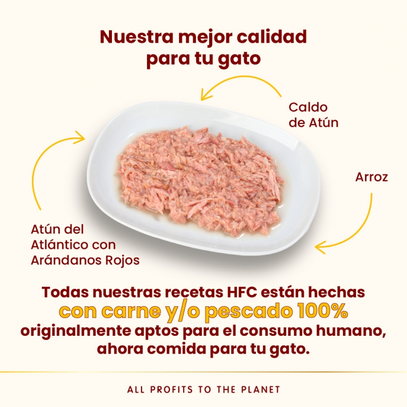 Receta HFC que combina filete de atún del Atlántico en su caldo con arándanos rojos, aportando una textura muy líquida y alta humedad que anima a beber, apoya la hidratación del gato y favorece el equilibrio del tracto urinario. Elaborada con ingredientes aptos para consumo humano, sin aditivos ni subproductos y con lista corta de ingredientes para una alimentación transparente y muy palatable.