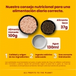Servir a temperatura ambiente, sola o mezclada con el alimento seco para aumentar la humedad total de la ración y potenciar el aroma y el sabor.