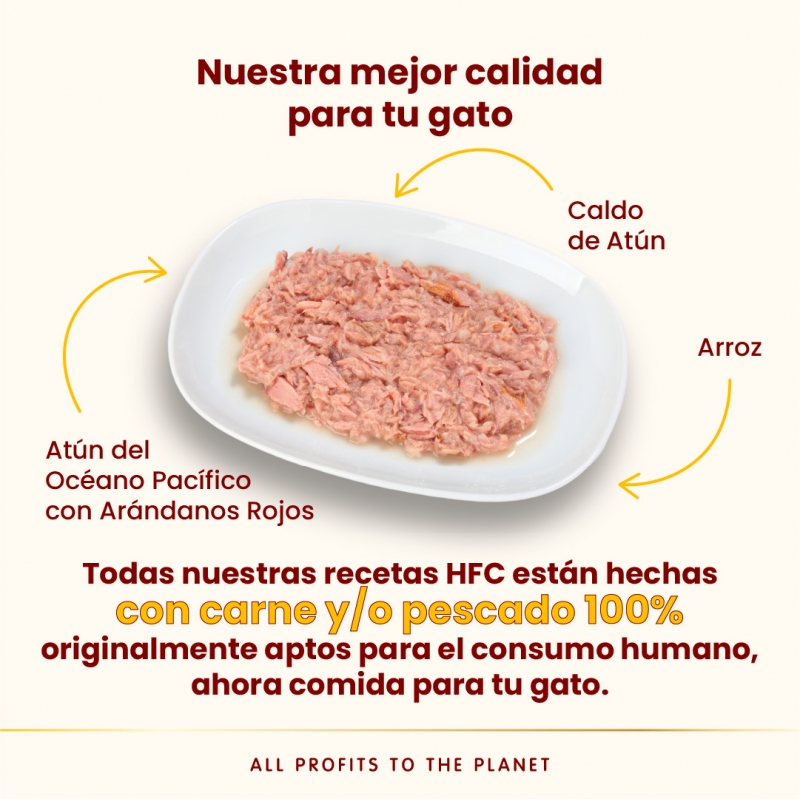 Receta HFC que combina filete de atún del Pacífico en su caldo con arándanos rojos, una fórmula de alta humedad que anima a beber, potencia la hidratación del gato y ayuda al cuidado del tracto urinario. Elaborada con ingredientes aptos para consumo humano, sin aditivos ni subproductos y con lista corta de ingredientes para una nutrición transparente y muy palatable.