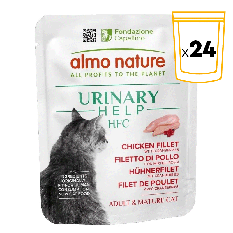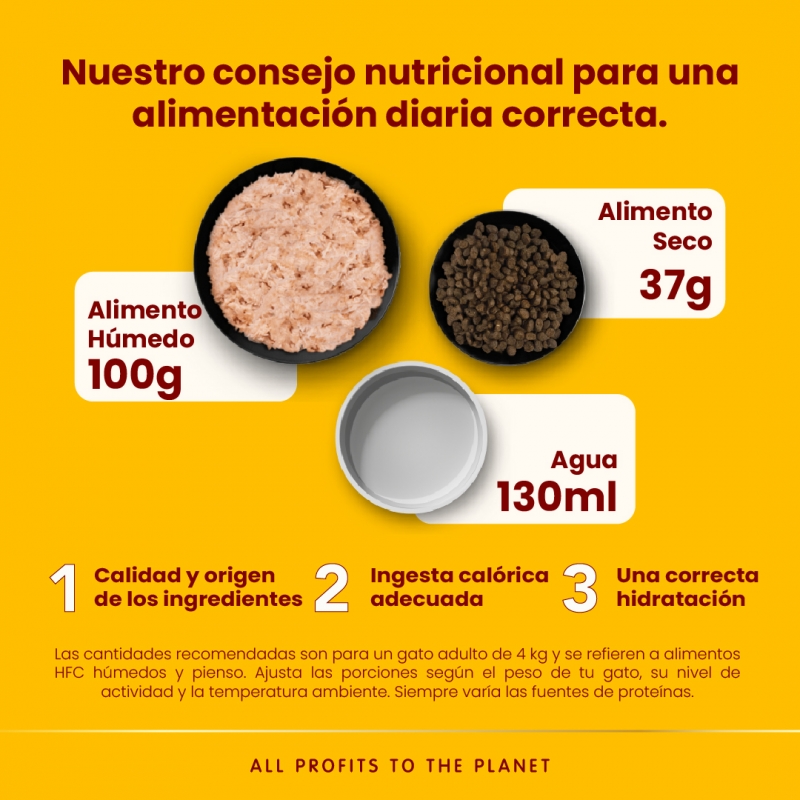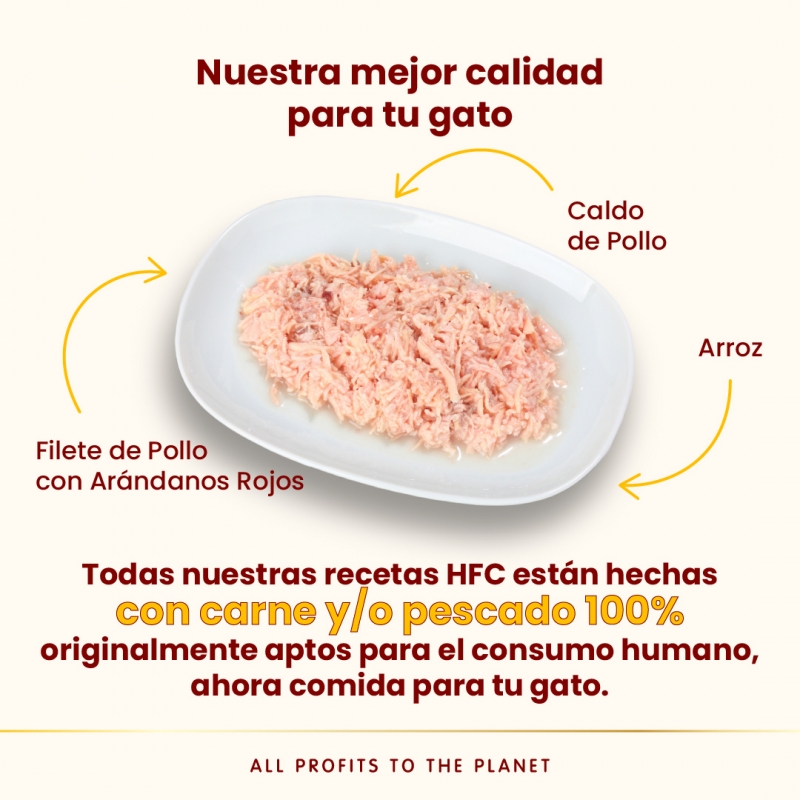 Esta receta HFC combina pechuga de pollo de calidad apta para consumo humano con caldo muy sabroso y un toque de arándanos rojos, ingredientes seleccionados que ayudan a la hidratación y cuidan el tracto urinario del gato. Es una fórmula sin aditivos, monoproteica en la fuente de proteína animal (pollo) y con lista corta de ingredientes para una alimentación transparente y fácil de combinar con su pienso.