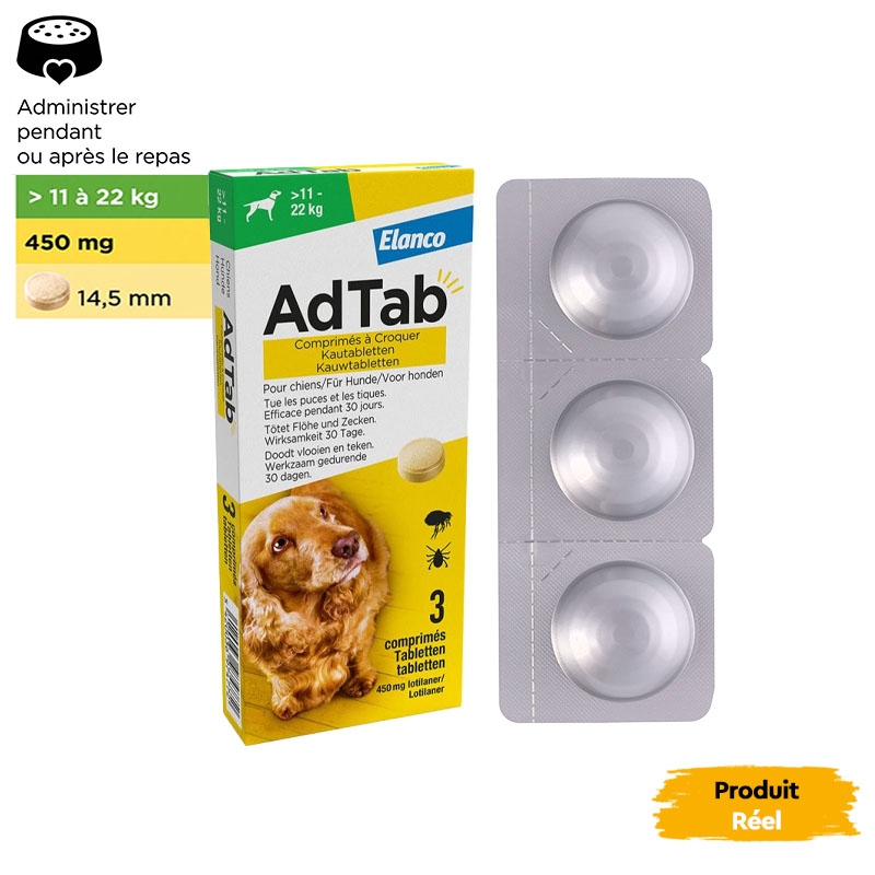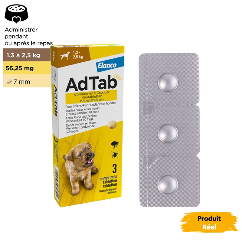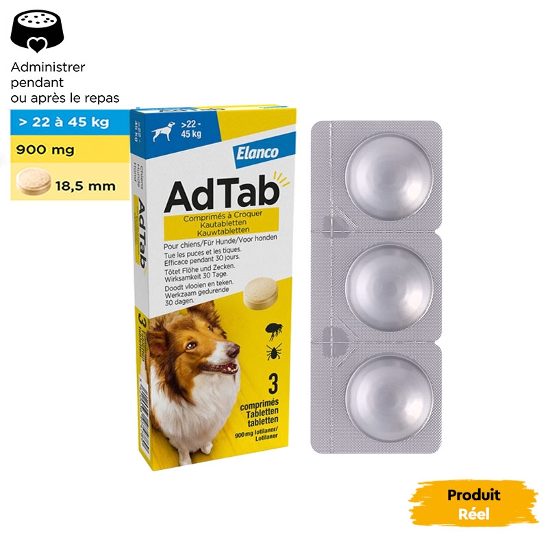 Élaboré par Elanco, AdTab est facile à administrer, car il est mâchable et peut être mélangé à la nourriture ou administré après le repas. Avec un agréable arôme de viande, votre chien acceptera ce comprimé sans problème, assurant des soins efficaces et agréables.
