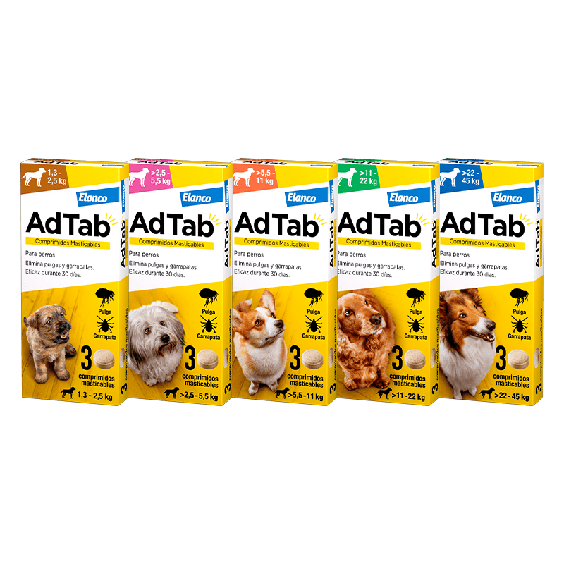 | ADTAB 112 mg COMPRIMÉS À MÂCHER POUR CHIENS (>2,5–5,5 kg), Boîte avec 1 blister de 3 comprimés | Chiens de >2,5–5,5 kg | 112 mg Lotilaner |