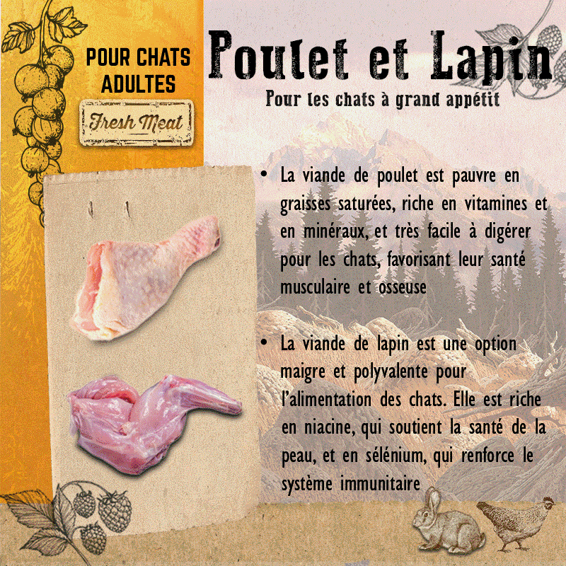 Formule gastronomique avec de la viande fraîche, sans céréales ni pommes de terre pour les chats adultes.