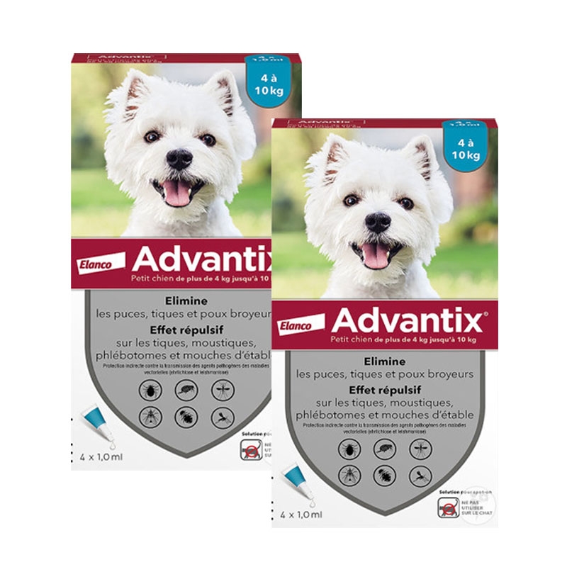 Advantix +10 kg est une pipette antiparasitaire conçue pour les chiens de petite race avec un poids compris entre 4 et 10 kg. Cette pipette, produite par les Laboratoires Bayer, a été créée pour prévenir et réduire l'apparition des tiques, des puces, des moustiques et d'autres insectes pendant 4 semaines. Consultez votre vétérinaire pour vérifier si c'est un traitement adapté à votre chien.