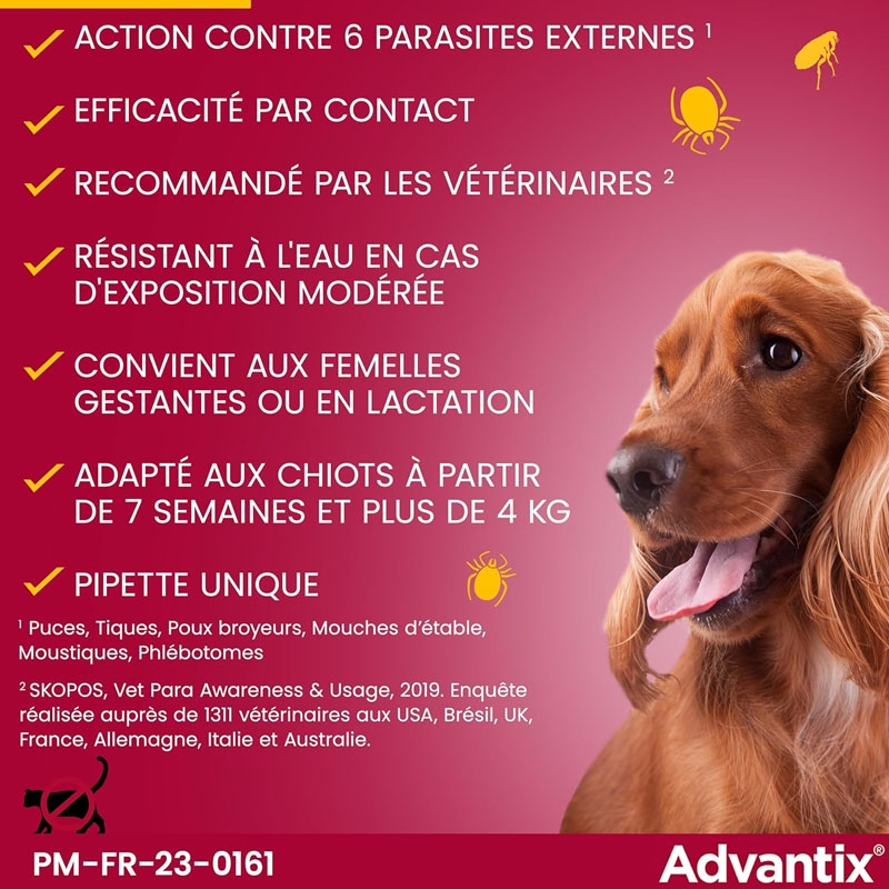 Aussi disponible : Advantix 0-4 kg pour chiens mini, Advantix 4-10 kg pour chiens petits et Advantix 10-25 kg pour chiens de taille moyenne.