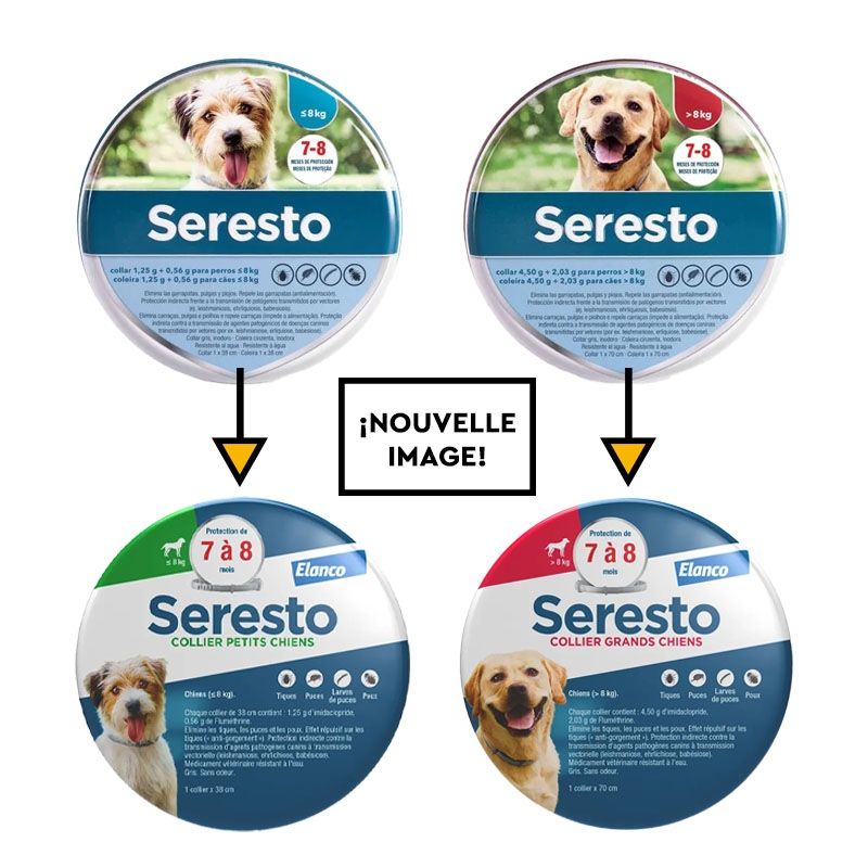 Les composants de Seresto sont libérés en continu pendant jusqu'à 8 mois, fournissant une protection contre les parasites externes (puces et tiques) et réduisant la possibilité de maladie due à la leishmaniose infantum.