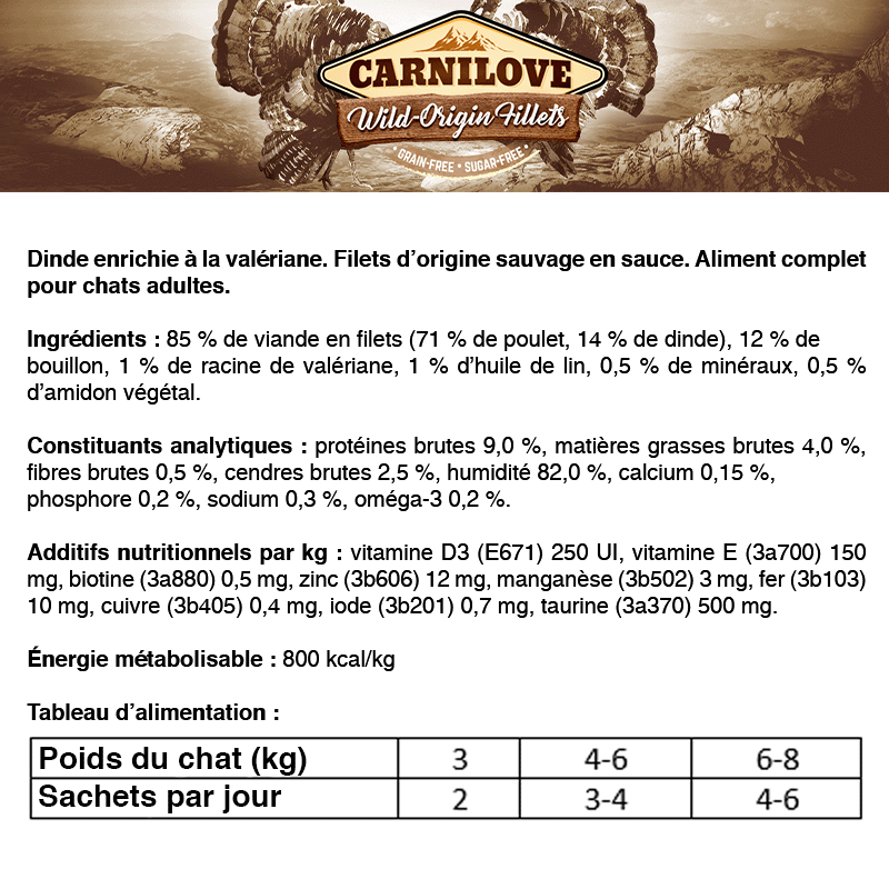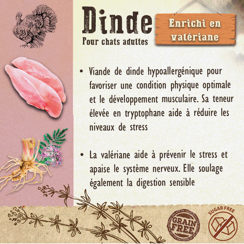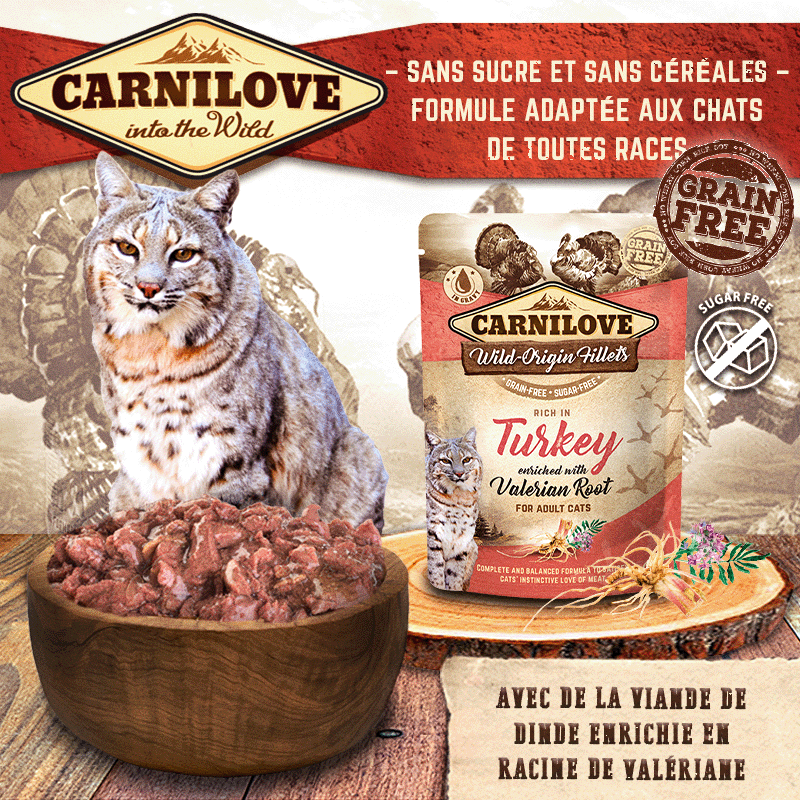 CARNILOVE Rich in Turkey Enriched with Valerian contient également certains ingrédients naturels qui renforcent le système immunitaire, ainsi que des nutriments spéciaux pour améliorer le pelage et la peau de votre chien. Parmi ces nutriments figurent les minéraux, les vitamines, la l-carnitine, la choline, les protéines et les acides gras essentiels. Ces derniers contribuent à améliorer la fonction digestive et l'absorption des nutriments, et contribuent également à maintenir la santé et les performances physiques des chiens.