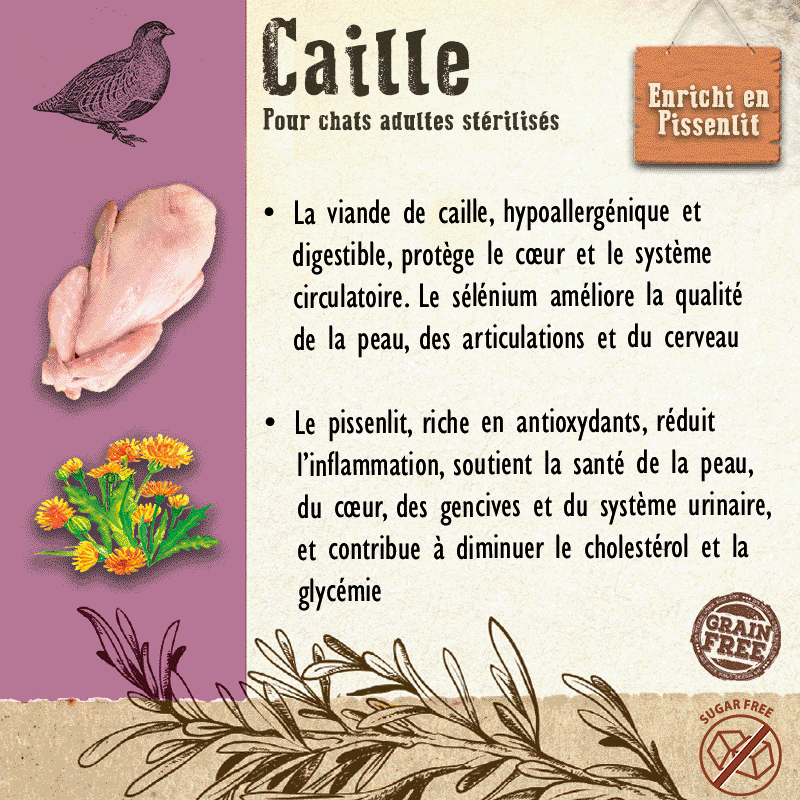 Cet aliment spécialement formulé pour les chats est une excellente façon de s'assurer que votre chat reçoive les nutriments nécessaires pour une vie longue et saine. Il est enrichi en caille, une source de protéines de haute qualité avec une saveur unique que votre chat adorera. De plus, cet aliment contient la dose idéale de quinoa riche en glucides, qui fournira une énergie durable pour une activité intense.