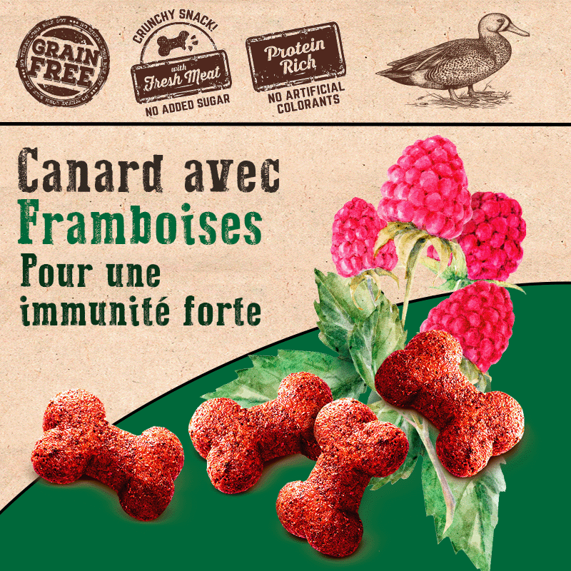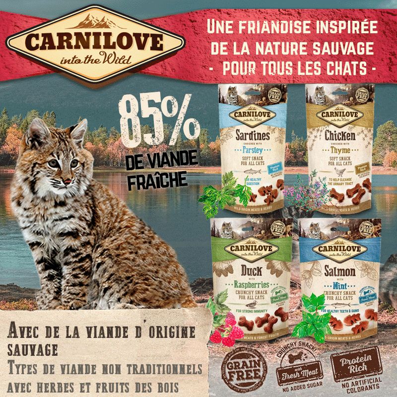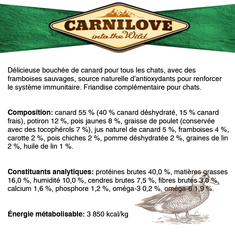 CarniLove Crunchy Duck avec Framboises pour Chats fournit aux félins domestiques des nutriments de la plus haute qualité pour promouvoir la santé et le bien-être à long terme. Cette nourriture innovante pour chats combine des saveurs uniques pour créer une délicieuse collation nutritive. Cette formule exclusive pour chats contient du canard comme première source de protéines dans la liste des ingrédients, ainsi que d'autres sources riches en protéines telles que la farine de poulet, les œufs et la lama. Les framboises et la luzerne sont également utilisées pour un apport nutritionnel supplémentaire. Ce mélange est une excellente source de fibres, de graisses saines, de minéraux et de vitamines, notamment les vitamines A et E pour maintenir une peau et un pelage sains.