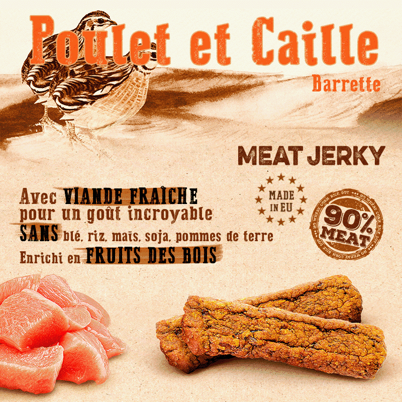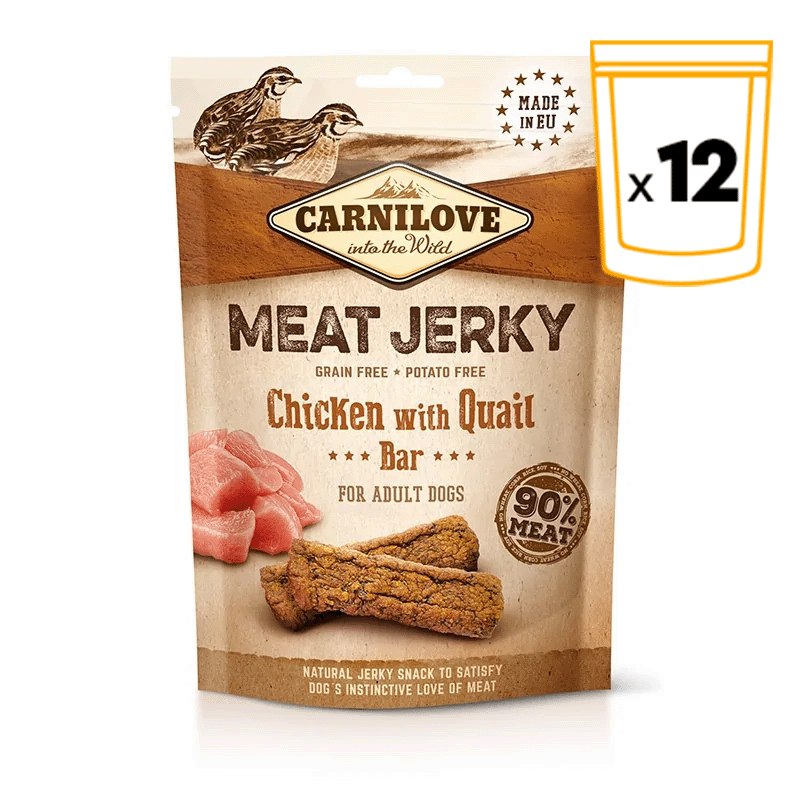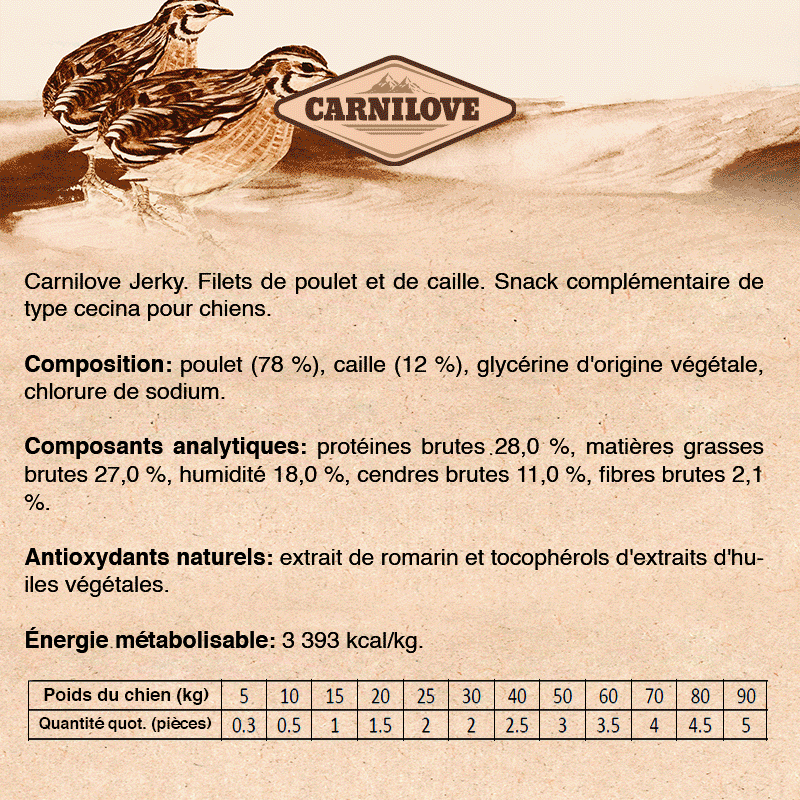 Carnilove Meat Jerky de Poulet avec Contour de Caille est une alimentation naturelle et innovante pour les chiens avec une excellente qualité et une haute valeur nutritionnelle. Il est enrichi d'une variété de délicieuses viandes de bœuf, de cailles, d'œufs, d'huile de poisson et de fruits de saison, ce qui en fait une friandise délicieuse pour les chiens. Cet aliment fournit des glucides complexes, des graisses insaturées, des protéines de haute valeur biologique qui permettront à votre chien de rester toujours en bonne santé.