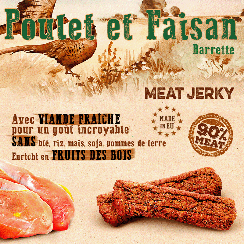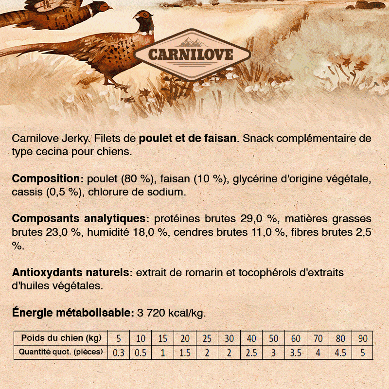 Carnilove Meat Jerky - Poulet avec Faisan est basé sur le régime ancestral de la nature pour les animaux. Il est fabriqué uniquement avec les meilleurs ingrédients pour garantir une absorption optimale de la nutrition, tout en maintenant la santé générale et le bien-être de votre chien. Il associe des protéines de haute qualité à des vitamines et minéraux essentiels pour satisfaire leur appétit et les maintenir actifs.