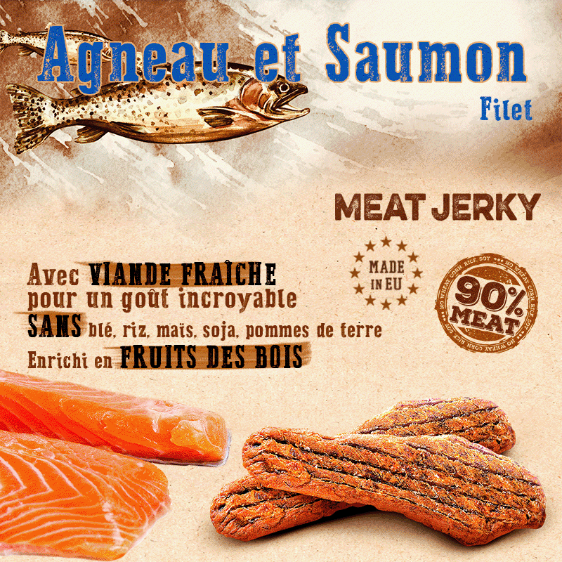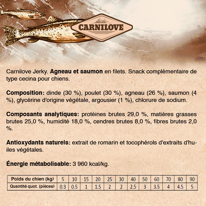 Carnilove Meat Jerky de Cordero con Filete de Salmón es un alimento nutritivo para perros. Reforzada con un 20.4% de proteínas de cordero, proporciona diversos beneficios nutricionales para la dieta equilibrada de los perros. Además, el filete de salmón aporta una gran cantidad de grasas Omega-3 y ácidos grasos poliinsaturados que contribuyen a una condición de salud saludable. Esta receta contiene una relación óptima de calorías, carbohidratos, proteínas, lípidos, minerales y vitaminas esenciales.