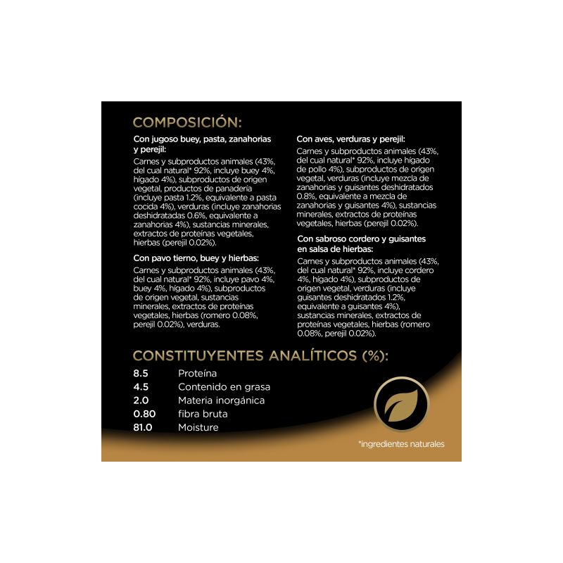 Cette nourriture humide pour chien propose une recette avec des ingrédients naturels, incluant des légumes frais et des protéines sélectionnées qui garantissent un apport complet en nutriments essentiels. Sa texture en pâté et gelée la rend facile à digérer et très attrayante pour les chiens, stimulant leur appétit.