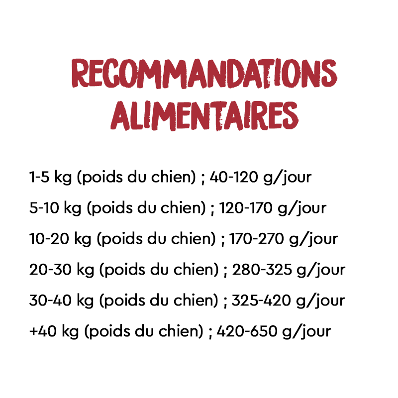 30-40 kg (poids du chien) ; 325-420 g/jour