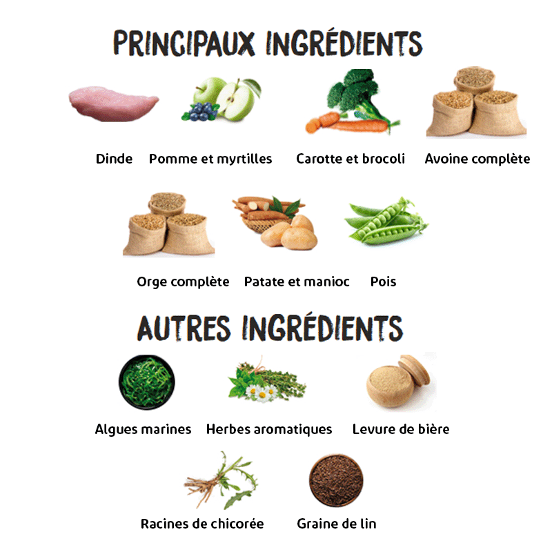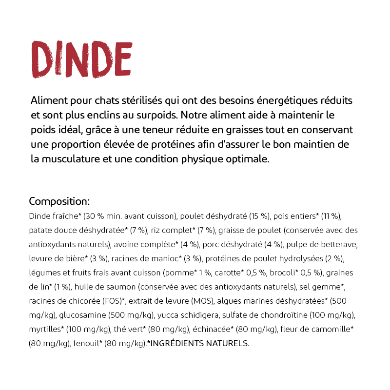 Dinde fraîche* (minimum 30 % avant cuisson), poulet déshydraté (15 %), pois entiers* (11 %), patate douce déshydratée* (7 %), riz complet* (7 %), graisse de poulet (préservée avec des antioxydants naturels), avoine complète* (4 %), porc déshydraté (4 %), pulpe de betterave, levure de bière* (3 %), racines de manioc* (3 %), protéine de poulet hydrolysée (2 %), légumes et fruits frais avant cuisson (pomme* 1 %, carotte* 0,5 %, brocoli* 0,5 %), graines de lin* (1 %), huile de saumon (préservée avec des antioxydants naturels), sel gemme*, racines de chicorée (FOS)*, extrait de levures (MOS), algues marines déshydratées* (500 mg/kg), glucosamine (500 mg/kg), yucca schidigera, sulfate de chondroïtine (100 mg/kg), canneberges* (100 mg/kg), thé vert* (80 mg/kg), échinacée* (80 mg/kg), camomille* (80 mg/kg), fenouil* (80 mg/kg). *INGRÉDIENTS NATURELS