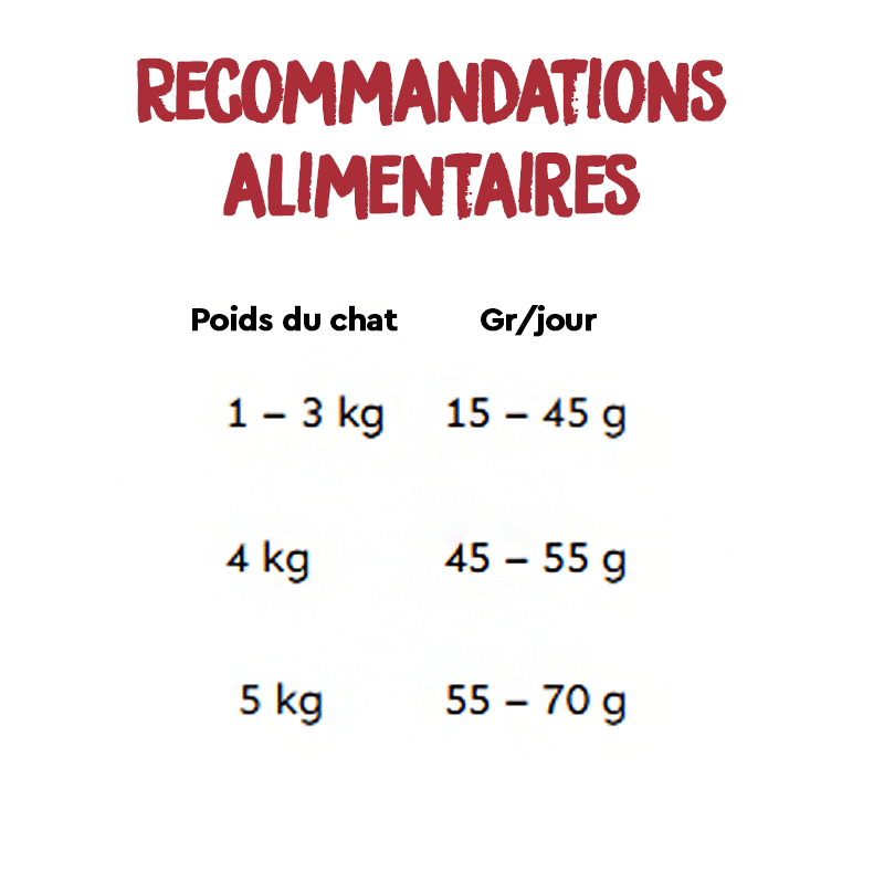 Après la stérilisation, les chats peuvent connaître des changements dans leur métabolisme et leurs besoins nutritionnels. Notre alimentation est conçue pour répondre à ces besoins spécifiques en offrant une proportion soigneusement équilibrée de nutriments. Cela comprend une réduction de l'apport en matières grasses pour prévenir la prise de poids, tout en maintenant une quantité adéquate de protéines pour le développement musculaire et la santé en général.