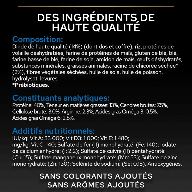 De plus, la teneur adaptée en minéraux régule le pH de l'urine, soutenant la santé des reins et des voies urinaires, ce qui est particulièrement bénéfique pour les chats stérilisés, qui présentent un risque accru d'infections urinaires. La recette est riche en dinde savoureuse et facile à digérer. De plus, la chicorée est une source naturelle de prébiotiques favorisant une microflore intestinale équilibrée. Cette alimentation complète et saine fournit toutes les substances vitales dont votre chat âgé et stérilisé a besoin pour favoriser son bien-être.