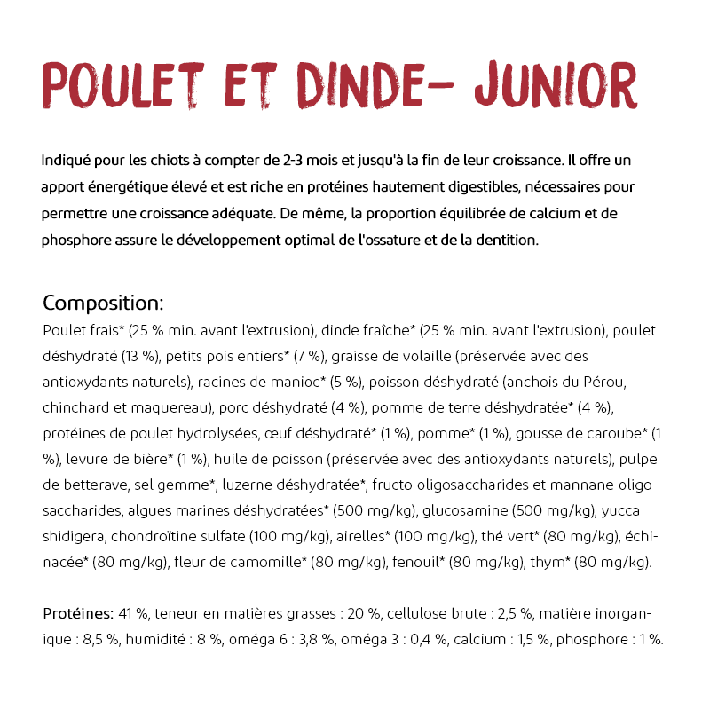 Viande fraîche de poulet et de dinde * (min 50% avant l'extrusion), viandes déshydratées (18%), pois entiers *, graisse de volaille (conservée avec des antioxydants naturels), racines de manioc *, poisson déshydraté (anchois, chinchard et maquereau), pomme de terre déshydratée *, oeuf déshydraté *, huile de poisson (conservée avec des antioxydants naturels), protéine hydrolysée de poulet, pulpe de betterave, pomme fraîche * (1%), caroube *, luzerne déshydratée *, levure de bière *, sel gemme *, fructo et manano oligosaccharides, algues déshydratées *, glucosamine, chondroïtine, yucca schidigera, myrtilles *, thym *, fleur de camomille *, fenouil *, échinacée *, thé vert *.