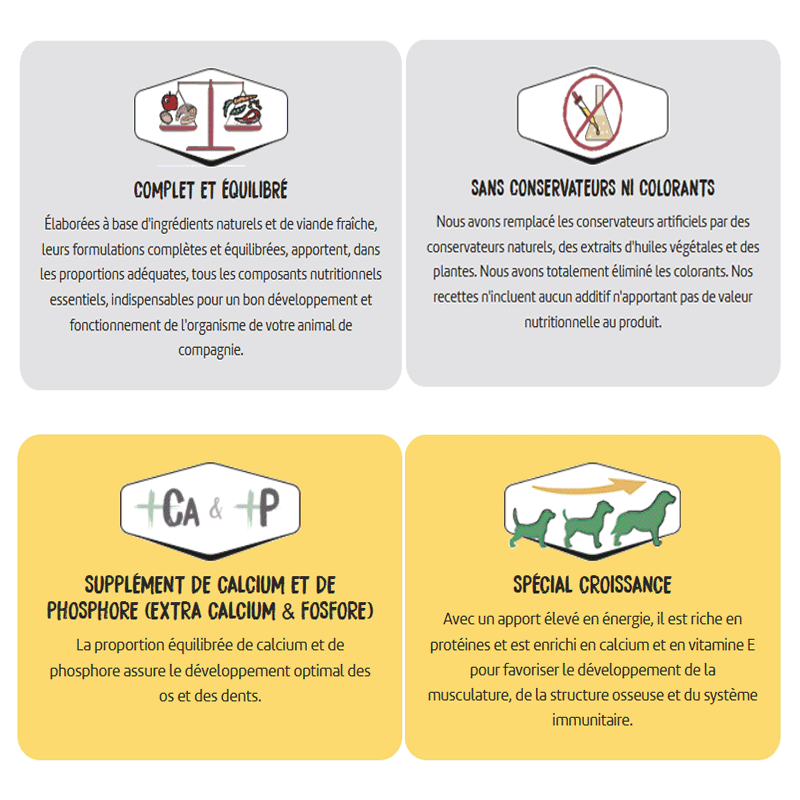 - Nourritures fraiches: La viande (70%), les fruits et légumes qui se trouvent dans les croquettes aident à nourrir votre chien pour renforcer sa santé. Cela grâce aux antioxydants et aux vitamines présents dans ces ingrédients.