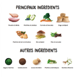 Poulet déshydraté (18 %), poulet frais* (au moins 15 % avant cuisson), dinde fraîche* (au moins 15 % avant cuisson), racines de manioc* (8 %), pois entiers* (7 %), riz complet* (7 %), graisse de poulet (conservée avec des antioxydants naturels), fèves entières* (4 %), orge complet* (4 %), patate douce déshydratée* (4 %), protéine de poulet hydrolysée (2,5 %), légumes et fruits frais avant cuisson (pomme* 1 %, carotte* 0,5 %, brocoli* 0,5 %), porc déshydraté (2 %), levure de bière* (1 %), pulpe de betterave, cosse de caroube* (1 %), huile de saumon (conservée avec des antioxydants naturels), graines de lin* (1 %), sel gemme*, luzerne déshydratée*, racines de chicorée (FOS)*, extrait de levures (MOS), algues marines déshydratées* (500 mg/kg), glucosamine (500 mg/kg), yucca schidigera, sulfate de chondroïtine (100 mg/kg), canneberges* (100 mg/kg), thé vert* (100 mg/kg), échinacée* (100 mg/kg), camomille* (100 mg/kg). *INGRÉDIENTS NATURELS