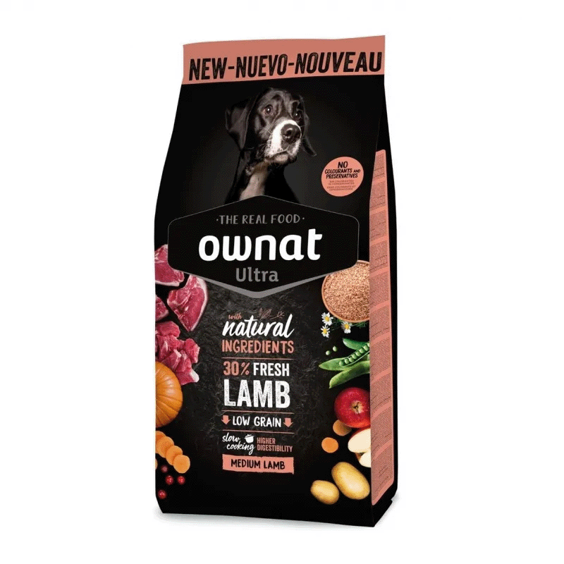 Les croquettes Medium Agneau & Riz d’Ownat contiennent de la viande fraîche et déshydratée complétée avec des fruits et légumes. C’est une nourriture holistique pour les chiens adultes de toute taille et race avec des sensibilités digestives ou des allergies et intolérances alimentaires.