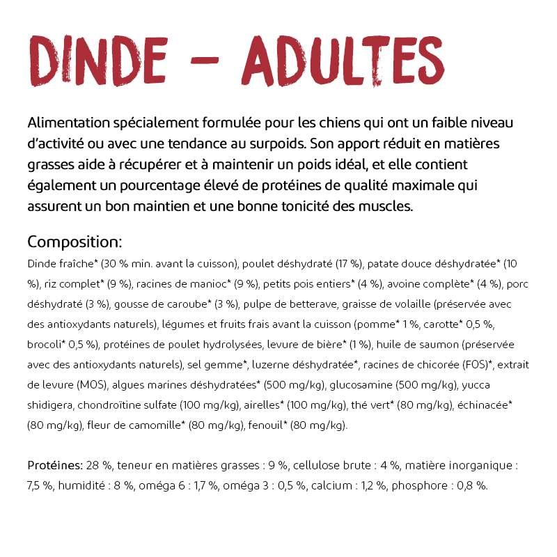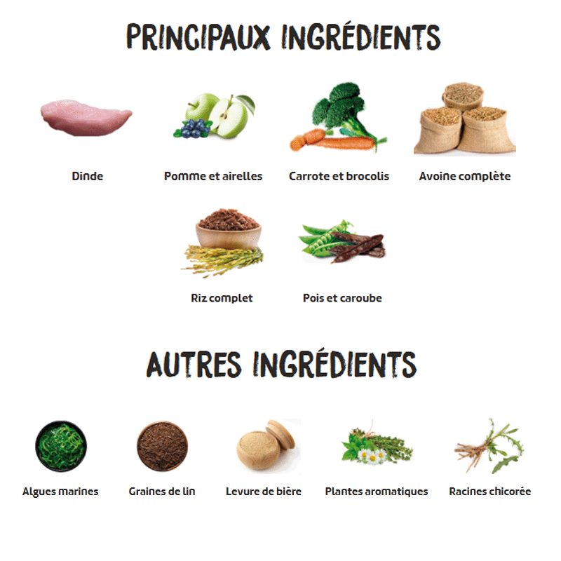 Dinde fraîche* (au moins 30 % avant cuisson), poulet déshydraté (12 %), pois entiers* (11 %), patate douce déshydratée* (10 %), riz complet* (7 %), porc déshydraté (6 %), avoine complète* (5 %), caroube* (5 %), racines de manioc* (3 %), protéine de poulet hydrolysée (2,5 %), pulpe de betterave, levure de bière* (2 %), légumes et fruits frais avant cuisson (pomme* 1 %, carotte* 0,5 %, brocoli* 0,5 %), graines de lin* (1 %), huile de saumon (conservée avec des antioxydants naturels), sel gemme*, luzerne déshydratée*, racines de chicorée (FOS)*, extrait de levures (MOS), algues marines déshydratées* (500 mg/kg), glucosamine (500 mg/kg), yucca schidigera, sulfate de chondroïtine (100 mg/kg), canneberges* (100 mg/kg), thé vert* (100 mg/kg), échinacée* (100 mg/kg), camomille* (100 mg/kg). *INGRÉDIENTS NATURELS