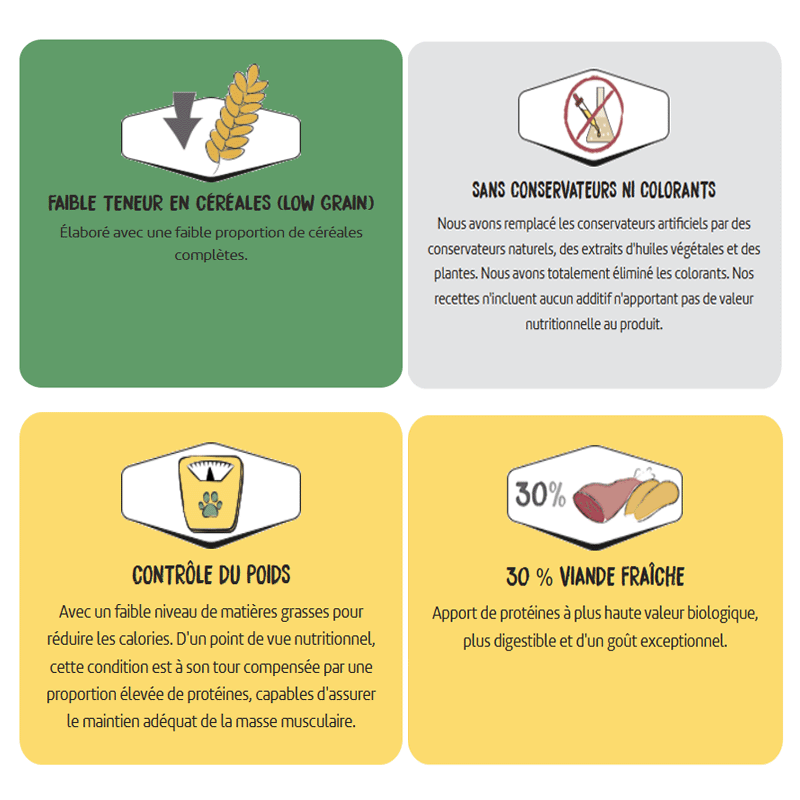 Exclut le maïs, le blé et le soja, améliorant la digestion et réduisant les intolérances alimentaires.