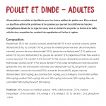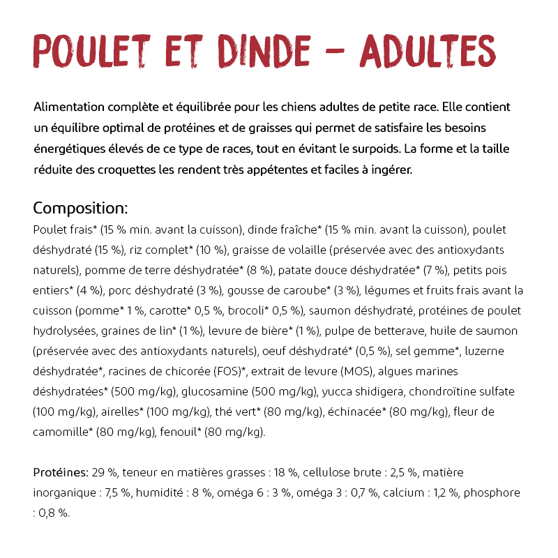 Poulet frais* (minimum 15 % avant la cuisson), dinde fraîche* (minimum 15 % avant la cuisson), poulet déshydraté (12 %), racines de manioc* (9 %), pois entiers* (9 %), graisse de poulet (préservée avec des antioxydants naturels), riz complet* (7 %), porc déshydraté (5 %), pomme de terre déshydratée* (4 %), caroube déshydratée* (3 %), orge entière* (2 %), saumon déshydraté (2,5 %), levure de bière* (2 %), protéine hydrolysée de poulet (2 %), légumes et fruits frais avant la cuisson (pomme* 1 %, carotte* 0,5 %, brocoli* 0,5 %), pulpe de betterave, graines de lin* (1 %), huile de saumon (préservée avec des antioxydants naturels), œuf déshydraté* (0,5 %), sel gemme*, luzerne déshydratée*, racines de chicorée (FOS)*, extrait de levures (MOS), algues marines déshydratées* (500 mg/kg), glucosamine (500 mg/kg), yucca schidigera, sulfate de chondroïtine (100 mg/kg), canneberges* (100 mg/kg), thé vert* (100 mg/kg), échinacée* (100 mg/kg), camomille* (100 mg/kg). *INGRÉDIENTS NATURELS