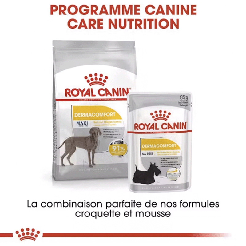 - Amélioration du pelage : Royal Canin Mini Dermacomfort 26 contient une combinaison de nutriments pour renforcer la peau du chien. Entre ces nutriments on y trouve les acides gras OMEGA 3 et OMEGA 6, connus pour ses bienfaits sur la peau et le pelage.