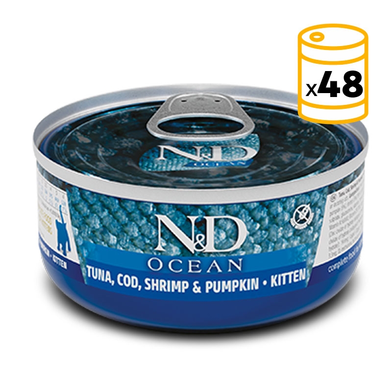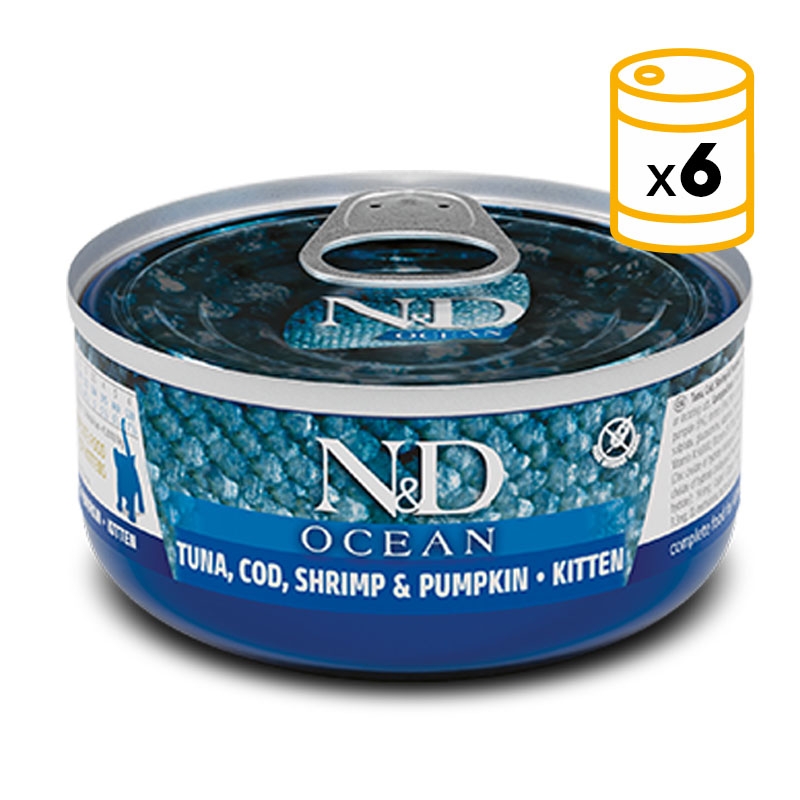 N&D Ocean Feline offre une alimentation complète pour les chatons, les chattes gestantes ou allaitantes avec du thon, de la morue, des crevettes et de la citrouille.