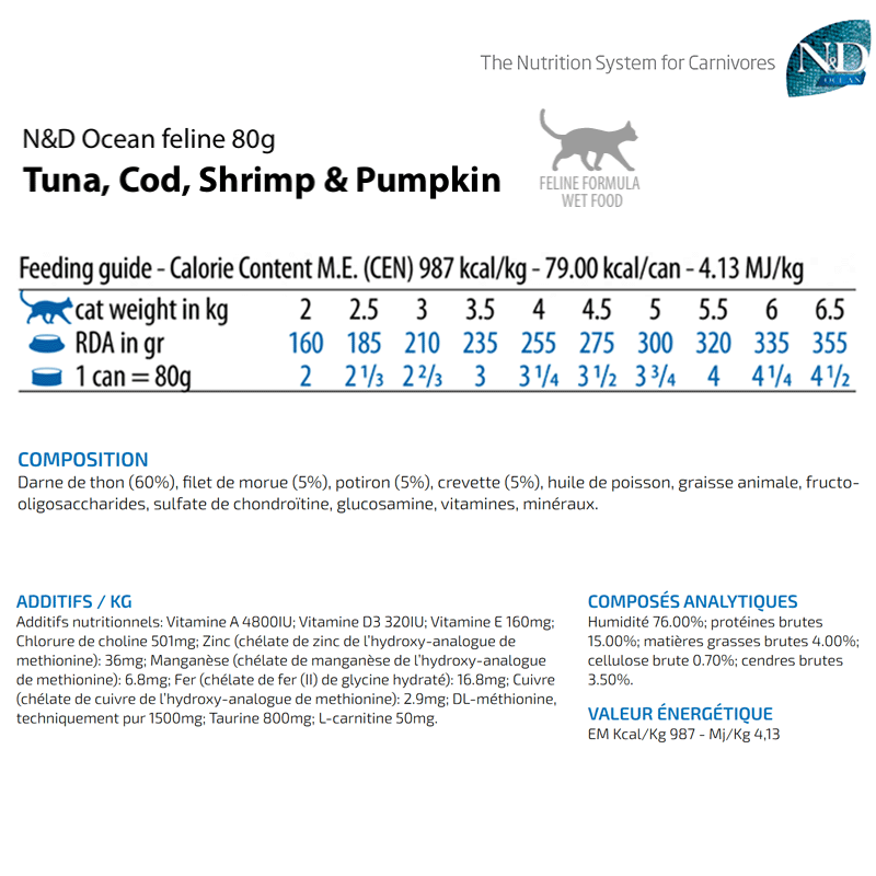 N&D Ocean Feline propose une alimentation complète pour les chats adultes avec une combinaison premium de thon, morue, crevettes et citrouille.