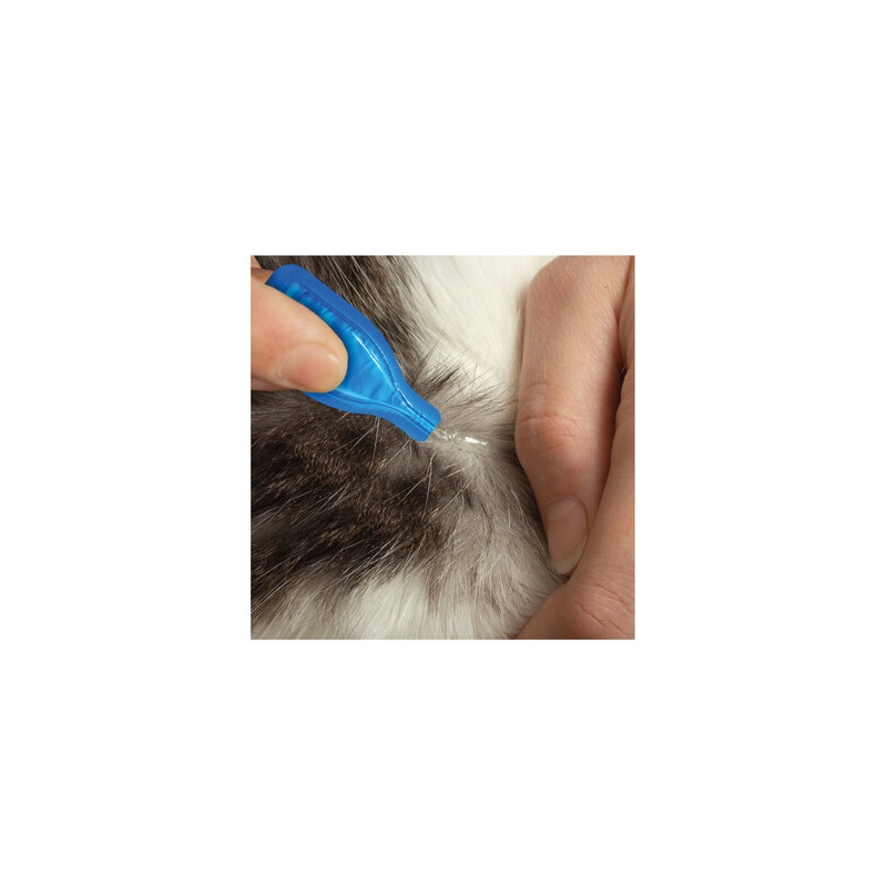Séparer le pelage du chat au niveau du dos jusqu’à rendre la peau visible et appliquer le contenu de la pipette directement. Répartir le produit de la zone des omoplates jusqu’au milieu du dos afin d’éviter que l’animal ne l’ingère. Ne pas appliquer tout le contenu en un seul point.
