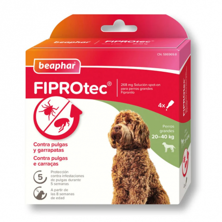 Pipettes antiparasitaires pour chiens grands de 20 à 40 kg avec fipronil, qui éliminent puces et tiques par contact, offrant jusqu’à 5 semaines de protection contre les puces et 4 semaines contre les tiques avec une application facile.