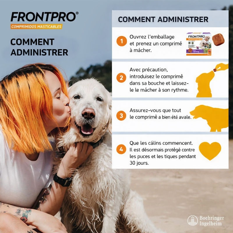 Découvrez la solution innovante de protection contre les puces et les tiques avec le nouveau FRONTPRO® en comprimé à mâcher, formulé avec de l'afoxolaner. Ce traitement rapide et efficace protège votre chien contre les puces, leurs œufs et les tiques, offrant une défense complète qui dure au moins 30 jours.