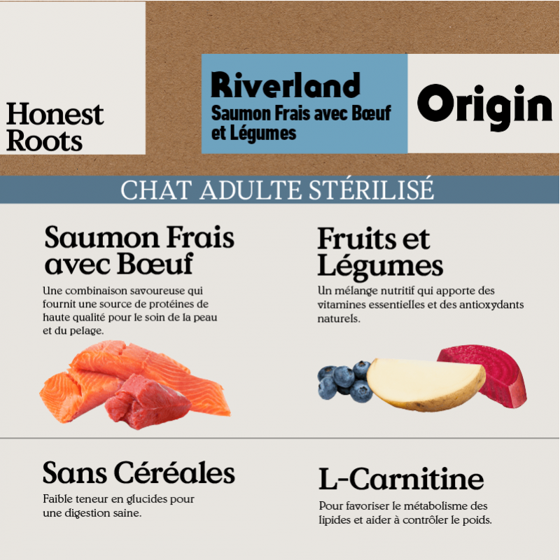Avec Honest Roots Origin Riverland, vous offrez à votre chat stérilisé une alimentation naturelle et complète, sans céréales et composée de vrais ingrédients. Des croquettes naturelles pour chats qui allient nutrition fonctionnelle, saveur et bien-être à chaque bouchée.