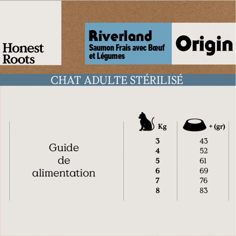 Introduisez progressivement la nourriture naturelle Honest Roots Origin Riverland sur 7 jours. Divisez la ration en 2 repas ou plus par jour et assurez-vous que votre chat ait toujours de l’eau fraîche à disposition.