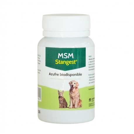 M.S.M. de Stangest est un complément nutritionnel formulé à base de méthylsulfonylméthane, une source de soufre biodisponible jouant un rôle essentiel dans le maintien de la santé ostéo-articulaire des chiens et des chats. Le soufre est un minéral fondamental dans la formation de collagène, kératine, élastine et autres protéines structurelles constituant les articulations, tendons, muscles et peau.