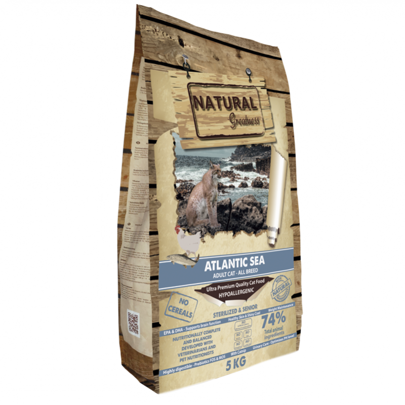 Natural Greatness Chats présente sa recette Atlantic Sea, des croquettes hypoallergéniques élaborées avec un fort pourcentage de saumon frais. Ces croquettes naturelles sont spécialement conçues pour Natural Greatness Chats Stérilisés et Natural Greatness Chats Senior, aidant à maintenir le poids idéal tout en apportant tous les nutriments nécessaires à une vie saine. Grâce à leur formule sans céréales, riche en acides gras oméga 3 et 6, elles favorisent la digestion, prennent soin de la peau et maintiennent un pelage brillant.