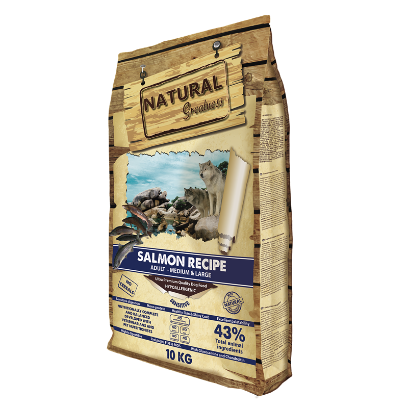 Aliment naturel au saumon sans céréales, idéal pour les chiens moyens et grands à digestion sensible, qui apporte une protéine monoprotéique, des acides gras oméga 3 et 6 et une grande appétence pour améliorer la santé, la peau et le pelage.