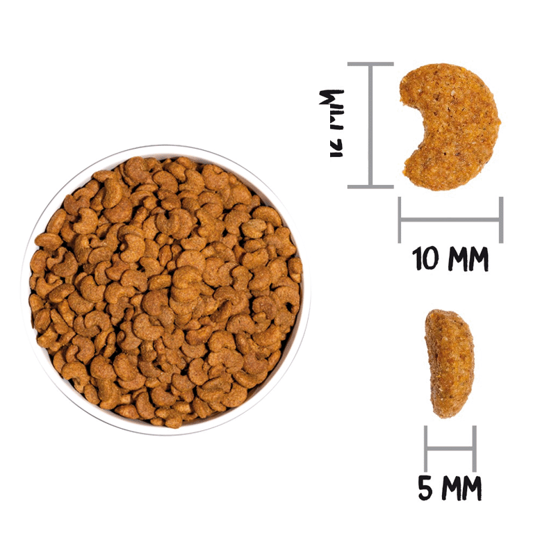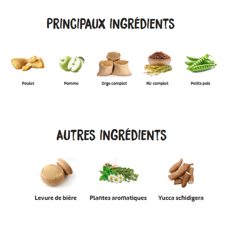 Ingrédients : Viandes déshydratées 22 %, poisson 15 % (poisson frais* 10 %, poisson déshydraté 5 %), blé complet* 15 %, graisse de poulet, orge entière* 9 %, maïs complet* 9 %, riz complet* 6 %, pois entiers* 3 %, protéine de maïs, levure de bière* 2 %, protéine hydrolysée de poulet, pomme fraîche* 1 %, huile de saumon, pulpe de betterave, fructo et manano oligosaccharides, herbes botaniques 0,02 % (fenouil*, camomille*, anis vert*), extrait de yucca schidigera.
