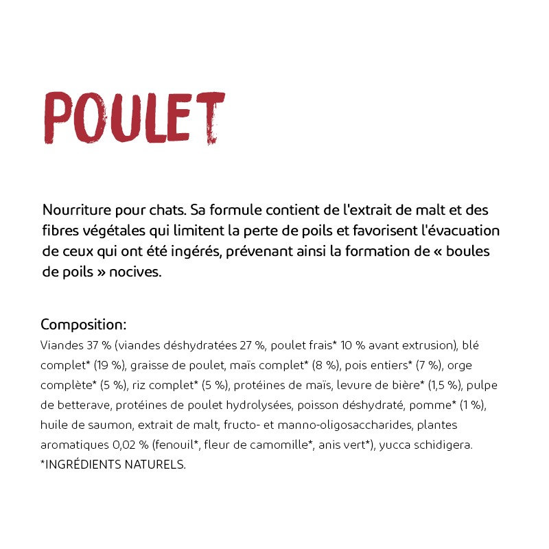 Cet aliment incorpore de l'extrait de malt et des fibres végétales pour limiter la perte de poils chez les chats.