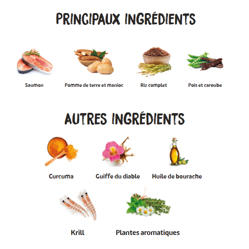 COMPOSITION : Saumon hydrolysé* (14%), riz complet* (13%), pomme de terre déshydratée*, gluten de blé hydrolysé (12%), graisse de volaille (préservée avec des antioxydants naturels), protéine animale hydrolysée (10%), racines de manioc*, gousse de caroube* (5%), pulpe de betterave, krill déshydraté* (2,5%), levures (nucléotides)* (1,5%), graine de lin* (1,5%), huile de saumon (préservée avec des antioxydants naturels), huile de bourrache (avec 20,5% d'acide gamma-linolénique) (0,5%), sel marin*, fructo et manano oligosaccharides, algues marines déshydratées (Ascophyllum nodosum)* (500 mg/kg), yucca schidigera, curcuma* (100 mg/kg), harpagophyton* (100 mg/kg), échinacée* (100 mg/kg), thé vert* (100 mg/kg). *Ingrédients naturels