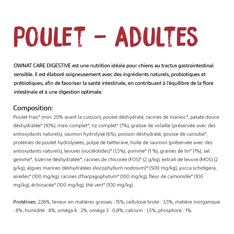 Réduction des Sensibilités Gastriques : OWNAT CARE DIGESTIVE est spécialement formulé pour les chiens ayant un système digestif sensible, offrant un soulagement efficace contre les sensibilités gastriques.
